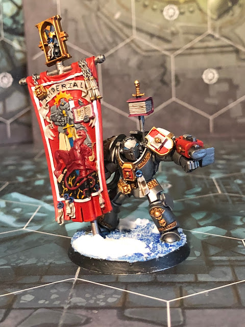 The Paladin Ancient was one of the original models I wanted in my full Terminator GK list way back at the start of 8th Edition, and has kind of sat collecting dust for a while. Painting him up was more of an afterthought, as he was mostly done and just needed the banner. I took the opportunity to paint the banner in mat colours, using greys and yellows over the silver and gold on the actual model. unfortunately I was a little over-zealous with my undercoating and I flattened some of the details on the banner. The end result for the banner is alright - concertina fine for the tabletop but a little off where I would like it to be. He may get a new banner next year...
